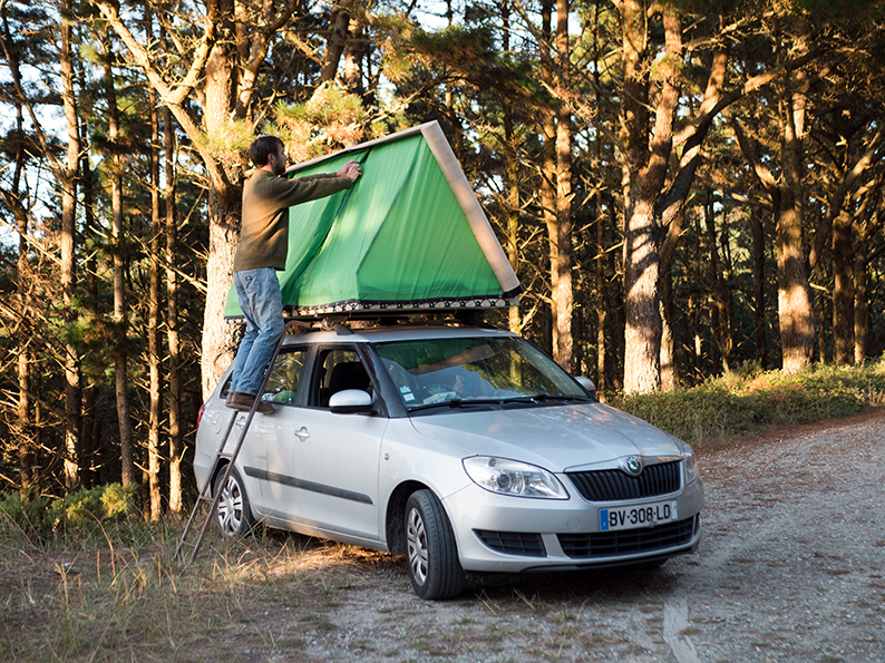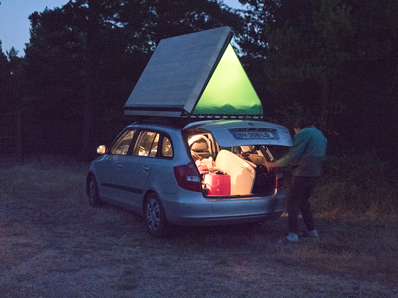 La tente de toit fermée présente un profil discret et un encombrement limité.La citadine option break que je possède m’a déjà surpris par sa capacité d’emport et j’ai donc décidé de concevoir un module d’abri sur mesure dans l’objectif de réaliser un road trip à deux personnes à travers la péninsule ibérique pendant deux semaines, en été.